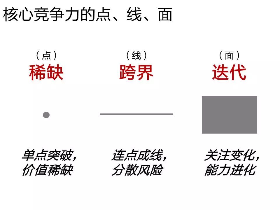 以上就是核心竞争力的三个特征,按顺序其实对应着能力的升级过程。