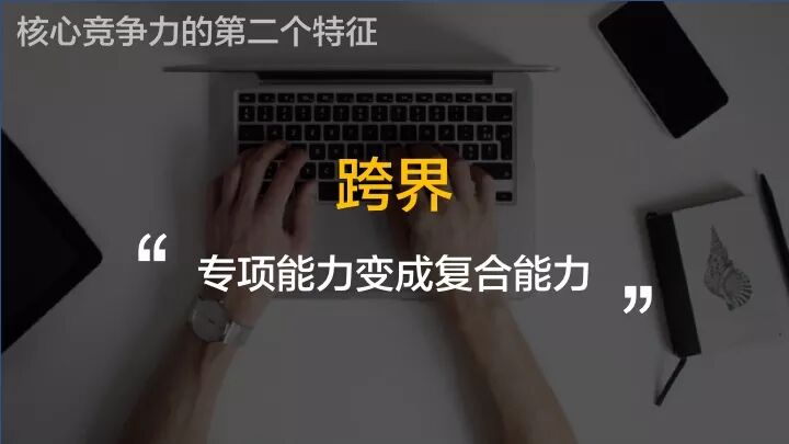 核心竞争力的第二个特征,是跨界。专项能力要向复合能力的方向发展。当你你会的东西越多,实际上也就分散了风险。在一个领域玩不转的时候,你可以马上调转方向。